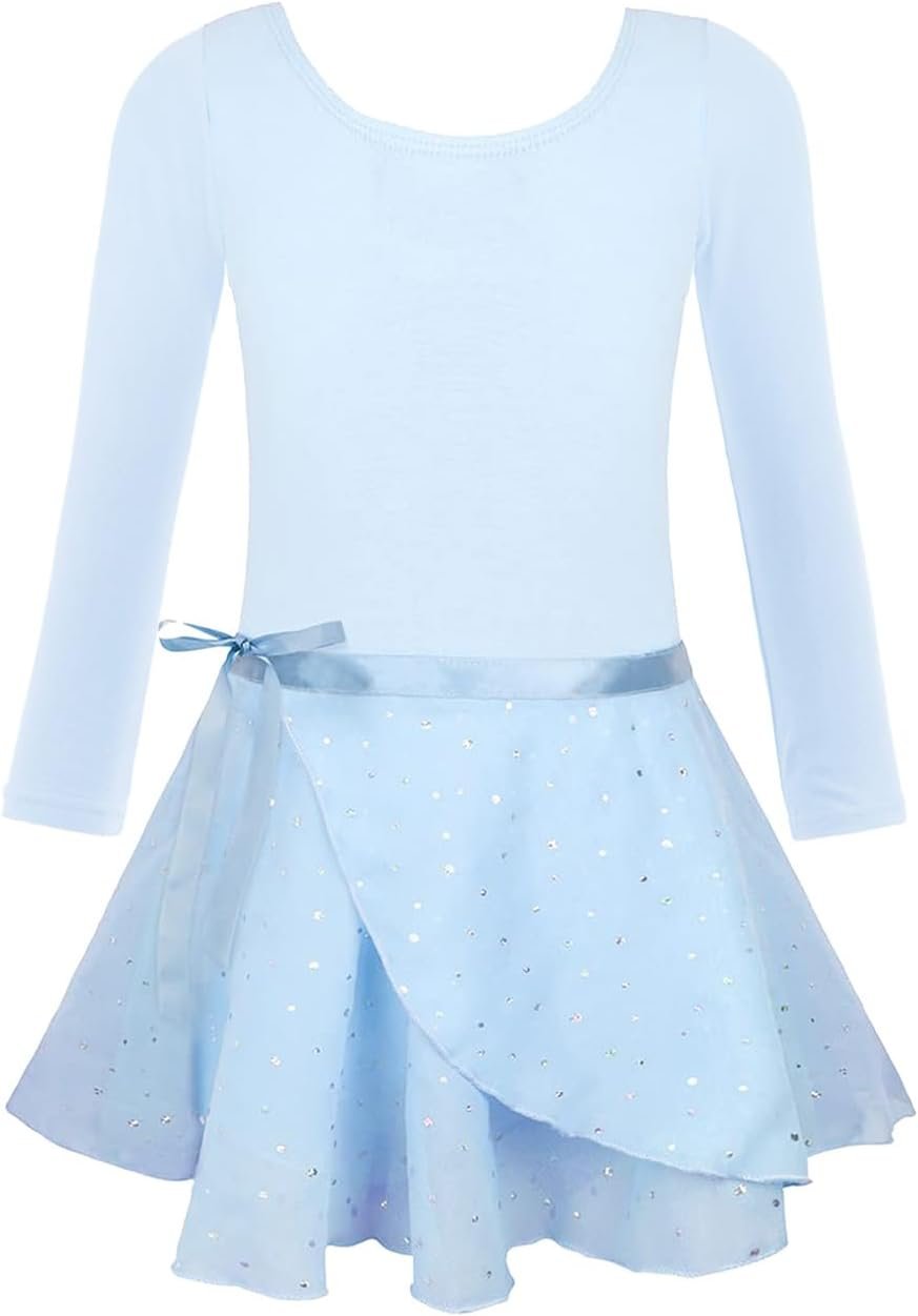 - Fabric: Long sleeve dance leotard with skirt,Upper-95% Cotton, 5% Spandex, comfortable, light-weighted, soft and stretchy, absorbing sweat well; Sleeve and Skirt-100% polyester with sequins.